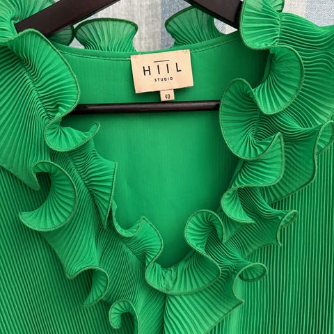 Hiil Studio bluse for dame i størrelse 42. Blusen er i blå bomull med vertikale striper i kontrastfarger. Den har rund hals med lett volangkant og knappestolpe foran med perleknapper. Lange ermer med mansjetter og knapper. Passer til hverdagsbruk eller mer formelle anledninger, og kan kombineres med både bukser og skjørt.