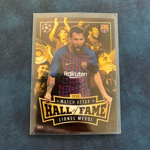 Topps Match Attax Trophy Triumph Lionel Messi samlekort. Kortet viser Lionel Messi med Champions League-trofeet i FC Barcelona-drakt. Baksiden har Match Attax-design med FC Barcelona-logo og turneringssymboler. Egnet for samling og oppbevaring i kortmapper eller plastlommer. Fotball kort fotballkort