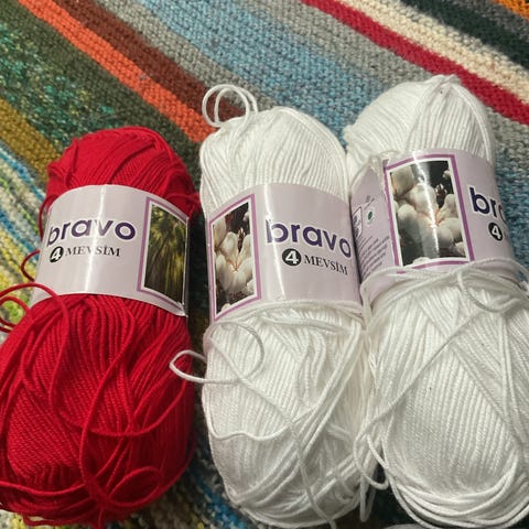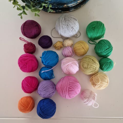 Garn, rester av bambus og bomull i rosa 50 gr, Cerise 25 gr., hvit 50 gr., grønn 75 gr., gul 40 gr., tutkis 70 gr., patrol 20 gr. (ca 325 gr)