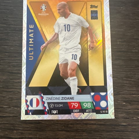 Topps Match Attax Euro 2024 Ultimate samlekort med Zinedine Zidane fra Frankrike. Kortet viser Zidane i hvit landslagsdrakt med nummer 10 og har design fra Ultimate-serien med ratingverdier for ulike ferdigheter. Baksiden har Euro 2024-logo, Frankrikes flagg og Match Attax-logo. Egnet for samling eller bytting av fotballkort. Fotball kort