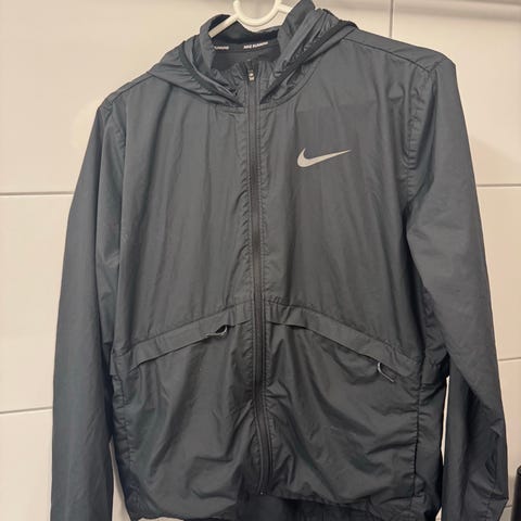 Nike løpejakke for dame i størrelse L. Jakken er svart og har hel glidelås i front. Den har hette, refleksdetaljer på ermer og rygg for bedre synlighet i mørket, samt justerbar stramming i livet hvis ønskelig. Skal være vanntett, men jeg opplever den som mer vannavstøtende. Egnet som ytterlag til løping og annen utendørstrening.kan sendes mot porto
