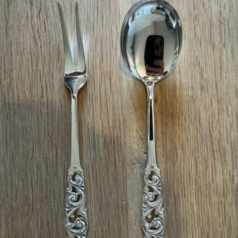 1 smørgaffel og 1 syltetøyskje, Aldri brukt. Epns 60. Gaffel 13 cm. Skje 14 cm.