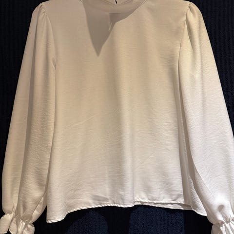 Hiil Studio bluse for dame i størrelse 38. Blusen er i perlefarge og laget av polyester. Modellen har lange ermer og høy hals med rynkedetaljer foran. Lukkes med glidelås bak i nakken. Stoffet har en glatt, lett blank overflate som gir et rent og enkelt uttrykk, egnet til både hverdags- og penere antrekk.