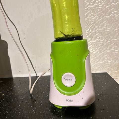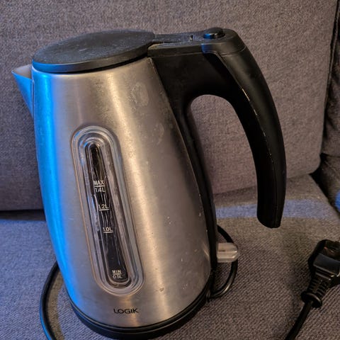 Pent brukt logik vannkoker i rustfritt stål. Vannkokeren har nivåindikator på siden og håndtak i plast. Den står på en separat sokkel med strømtilkobling.