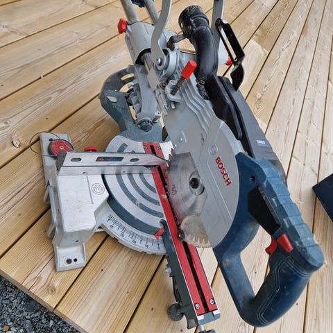 Dette er en elektrisk kapp- og gjærsag fra Bosch sin Professional-serie, modell GCM 10 SD. Sagen har justerbar gjærings- og kappevinkel med tydelig gradskala på bordet. Den er utstyrt med skyvefunksjon for økt kappelengde og har integrerte føringsstenger. Maskinen har beskyttelsesdeksel over sagbladet og feste for støvavsug.