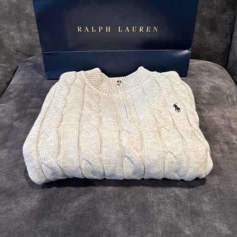Ralph Lauren Polo genser for herre i størrelse M men kan passe til størrelse S. Genseren er blå og strikket i bomull med flettestruktur.
