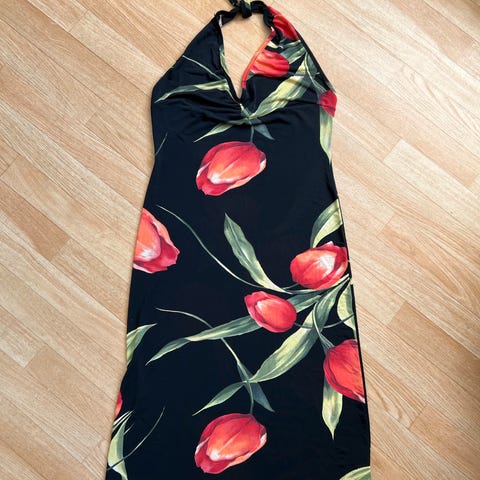 Kjolen har to snøringer som festes rundt halsen og holder både overdelen og hele kjolen på plass. Snøringene har samme florale mønster, er veldig lange og faller løst og elegant over den åpne ryggen.