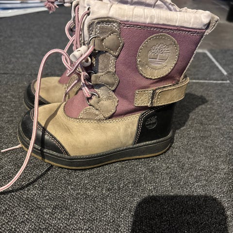 Timberland vintersko for barn i størrelse 24. Skoene er lilla med rosa detaljer og har kraftig yttersåle med godt mønster. Modellen har to borrelåsstropper over vristen. Overdelen er i et semsket materiale kombinert med tekstilpartier, og innsiden er godt polstretr.