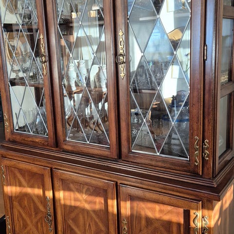 Vitrineskap i furu med to glassdører og fire skuffer nederst. Skapet har profilerte kanter og klassisk utforming. Innvendig er det flere hyller for oppbevaring og utstilling av servise, glass eller pyntegjenstander. Passer til stue, spisestue eller kjøkken der det er behov for både oppbevaring og innsyn i skapet.