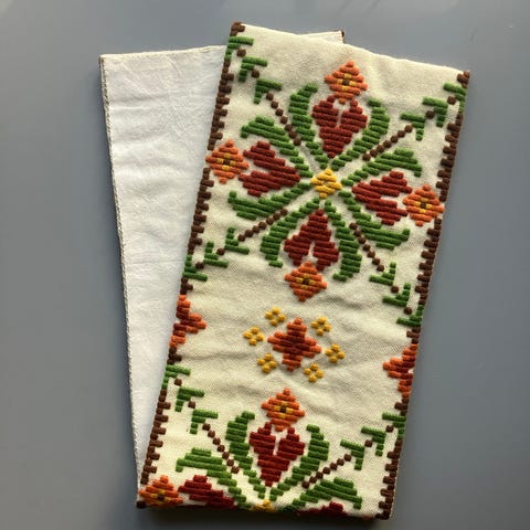 norsk - duk - håndarbeid - husflid - klostersøm - naturmaterialer - retro - modern - rød - blå - gul - hvit - redesign - vårlig - sommerlig - folkekunst - kunsthåndverk - tekstilkunst