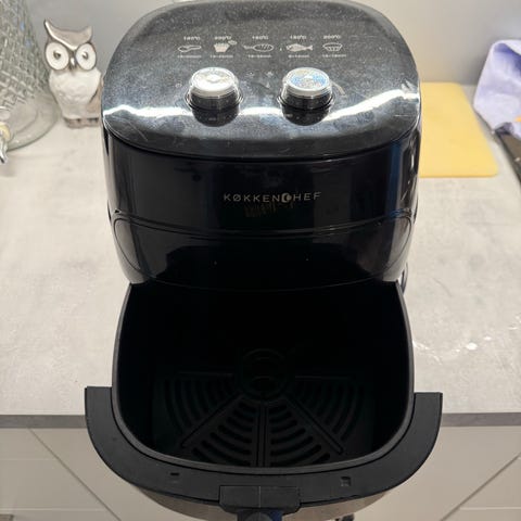 Philips airfryer i svart utførelse. Modellen har frontplassert håndtak og manuelle brytere for temperatur og tid på fronten. Enheten har uttakbar kurv/skuff for mattilberedning og strømledning med vanlig støpsel. Egnet til steking og oppvarming av ulike typer mat ved hjelp av varmluft. Passer til bruk på kjøkkenbenk i hjemmet.Philips Airfryer HD9200/90, 4.1 L