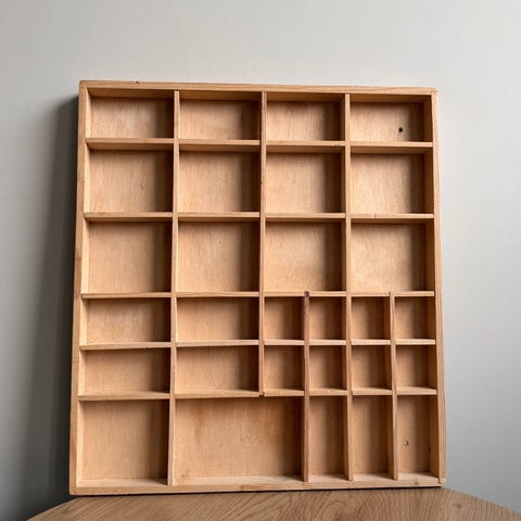 Pent brukt vegghylle i tre med flere små rom. Klar til oppheng.