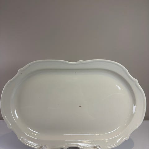 Tidløs og dekorativ serveringsform i hvitt porselen fra Porsgrunds Porselænsfabrik, produsert i 1957 (datert stempel under).