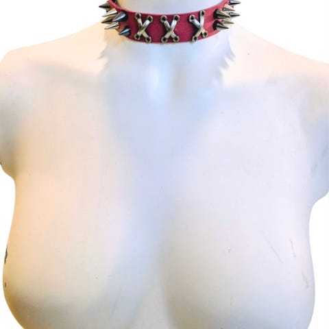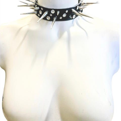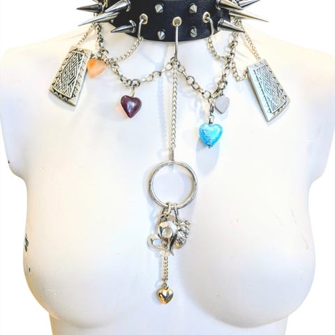 Ubrukt! Ny sølvfarget faux skinn hals smykke/chocker. Med lenker og perler og sorte metallic nagler som er spisse pigger. Perler og svart onyx stein krystall perler. Goth, punk, cyber, trance, grunge, rock, y2k, metall.