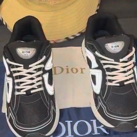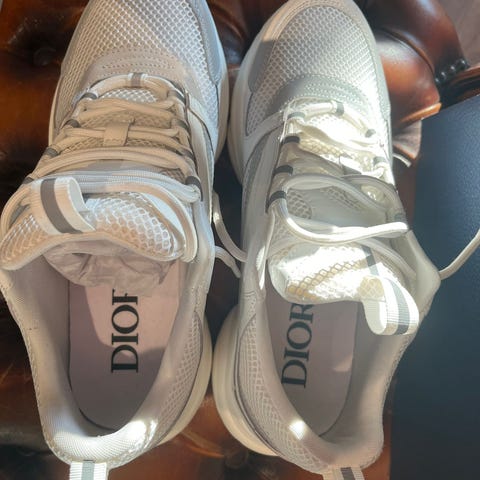 Dior sneakers joggesko i størrelse 46. Modellen har svart overdel med hvite og lyse detaljer samt hvite lisser. Skoene har polstret innersåle med Dior-logo og kraftig yttersåle i lys farge. Passer som fritidssko eller til hverdagsbruk. 45 vil være akkurat i tide.