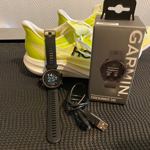 Garmin Forerunner 245 med burgunder klokkereim av silikon, kjøpt i november 2023.