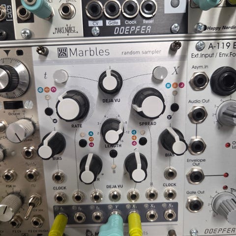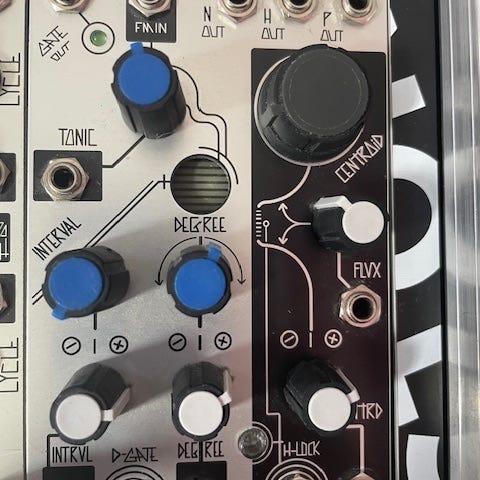 vpme.de Euclidean Circles V2 eurorack triggersequencer. Modul for eurorack-system med flere uavhengige triggerspor basert på euklidiske rytmer. Frontpanel i blå farge med tre store dreiehjul omgitt av LED-indikatorer for visning av steg og mønstre. Modulen har innganger og utganger for klokke, reset og flere triggerkanaler, samt kontroller for justering av lengde, fyll og rotasjon av rytmer. Egnet som rytmegenerator i modulærsynth-oppsett.