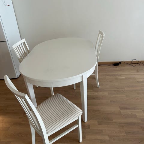 Stort heltre spisebord med 10 stoler gis bort da jeg ikke har plass når jeg flytter. Det følger med 1 ekstra plate på 50 cm, så man kan lett sitte 10 personer rundt bordet.