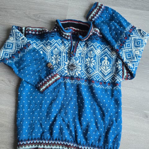 Hjemmestrikket genser ca str L i Dalegarn. Aldri brukt. Mål: 58 cm skuldervidde, 67 cm lang, erme 46 cm