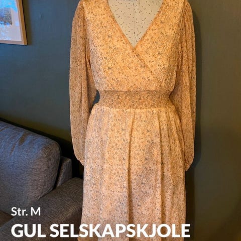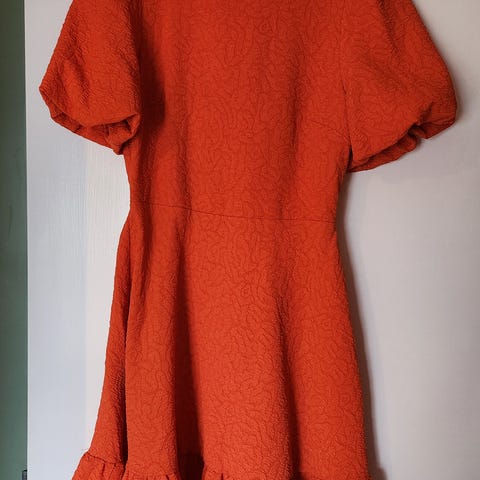 Vila sommerkjole for dame i størrelse XS. Den har omslagseffekt foran, korte ermer med liten volangkant og volang nederst på skjørtet. Passer som lett sommerkjole til hverdagsbruk eller enkle anledninger.