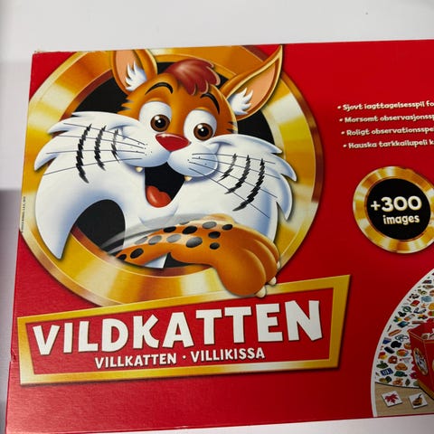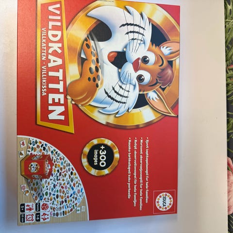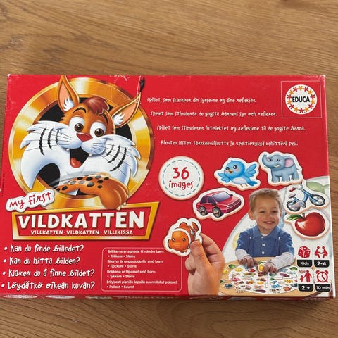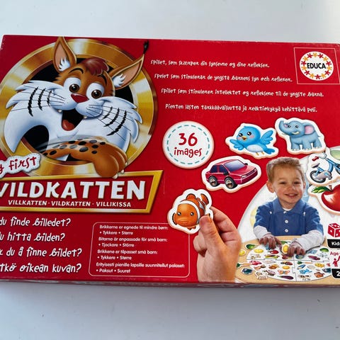 Educa Vildkatten brettspill. Familiespill der spillerne skal finne illustrasjoner på spillebrettet som matcher bildene på kortene. Spillet egner seg for barn og familier, og kan bidra til å trene observasjonsevne og reaksjonsevne. Språk på esken inkluderer flere nordiske språk.