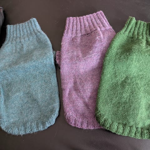 Tre, røde potesokker i fleece selges. Skinnforsterket og med to borrelåser på hver sokk for bedre feste. Antagelig bare brukt 1 gang, så minimal slitasje, se bilder. Kan passe til små hunder med litt større poter som små terriere. Sender gjerne