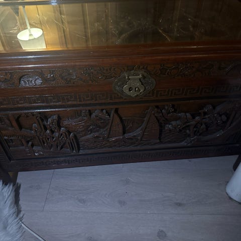 Selger en gammel kiste, fint å bruke som bord/tvbenk, og har oppbevaring inni, via at man åpner toppen som har hengsler.