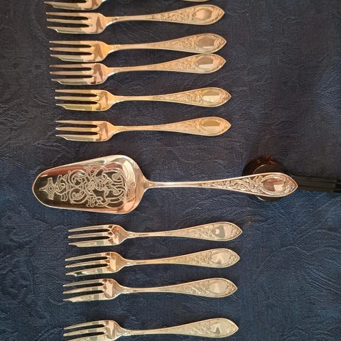 Det er 12 gaffler, 12 kniver og 9 kakegafler