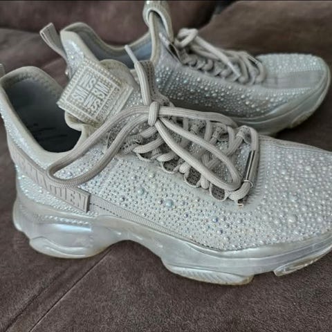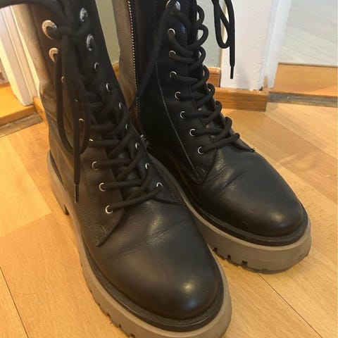 Støvlene er ankelhøye militærstøvler (combat boots) med snøring og et grått og svart slangeskinnmønster. De har en tykk, solid såle.