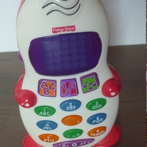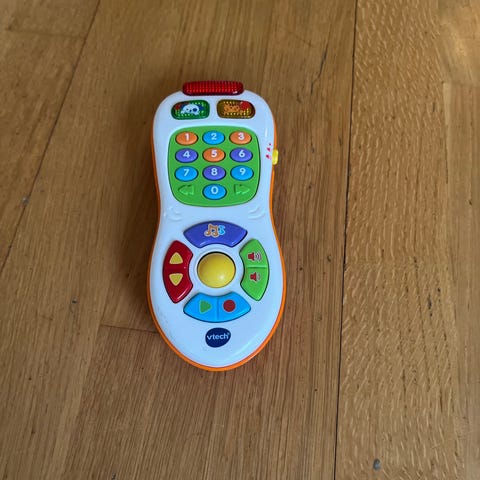 Leketøy mobiltelefon for barn i hvit farge. Telefonen har trykkbare knapper med fargerike symboler og tall på skjermen. Egnet som rollelek-leke der barn kan late som de ringer og bruker mobiltelefon. Passer for små barn som liker lyd- og knappespill, avhengig av anbefalt alder fra produsent (ikke oppgitt).
