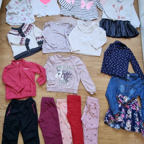 Klespakke med ull og vinterklær. Noen av klærne er godt brukt, noen er brukt og noen av klærne er pent brukt. Normal bruksslitasje, nupper, små flekker og noen av ullplaggene har hatt hull som er reparert. Jeg har prøvd å ta bilder så godt det lar seg gjøre. Mye god bruk igjen i klær som har blitt godt tatt vare på:) Vinterdress er mest slitt på knær og reflekser. Noe er 98/104, noe er ren 104 og en genser er 110. Men brukt samtidig.