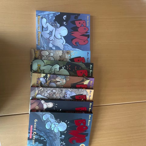 Bone tegneseriebøker i norsk utgave. Bildet viser flere bind, blant annet «Reisen fra Boneville», «Det store ku-løpet» og «Stormens øyne». Bøkene er innbundne tegneserier med fargetrykk. Egner seg for lesere som liker fantasy- og eventyrserier i tegneserieformat.