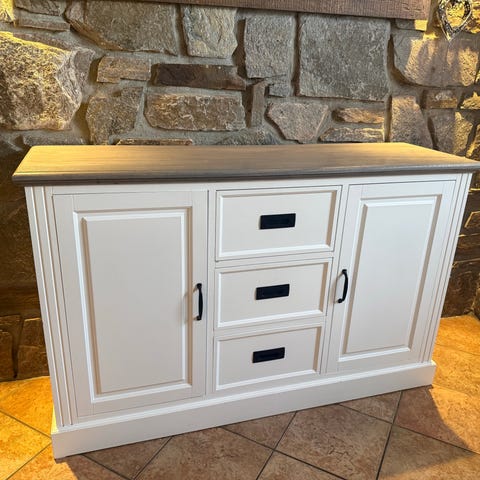 Selger pent brukt skjenk, grunnet har litt for mye ting og møbler. 133 cm bred, 42 cm dyp, 68,5 cm høy. Hvit, og med 2 sett skuffer, da jeg lider av om-møblerings lidelse 😅 1 sett i blå, det andre i lys eik. Der er 2 små merker i topplaten, men det er mulig å skaffe lakk å fikse.