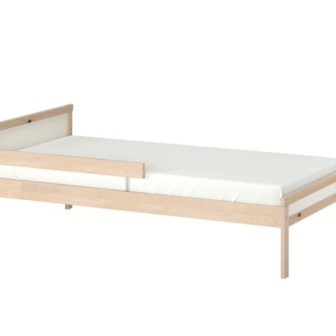 IKEA juniorseng i hvit utførelse. Sengen har sengehest på langsidene og er egnet for barn som har vokst ut av sprinkelseng. Rammen er i treverk med sprosser på sidene. Passer til standard madrass for juniorseng. Egner seg til barnerom som overgangsseng mellom sprinkelseng og vanlig enkeltseng.