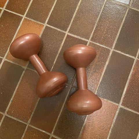 Håndmanualer til styrketrening i grå plast. Manualene har kuleformede ender og rett grep