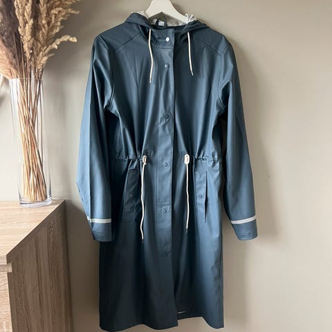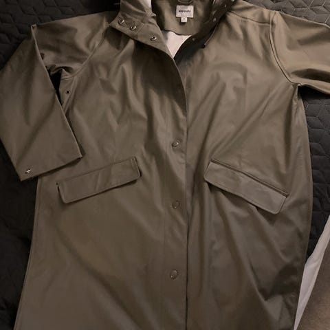 Lindex regnjakke for dame i størrelse S. Jakken er beige og laget i polyester. Den har hette med snøring, knappelukking foran og lommer i siden. Materialet er vanntett og egnet som regntøy til hverdagsbruk og utendørsaktiviteter i vått vær.