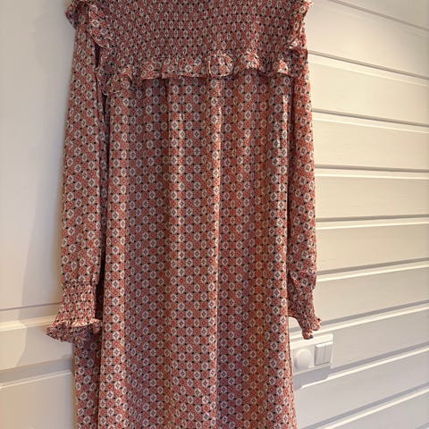 Lindex kjole for dame i størrelse XL. Kjolen er i beige bomull med heklet/nettstruktur og korte ermer. Den har v-utringning og knytebånd foran. Passer som lett sommerkjole eller som lag-på-lag-plagg over annet tøy.