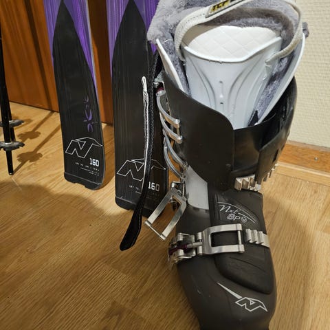 Rossignol Radical R Racing alpinski i svart og oransje design. Skiene er utformet for preparerte bakker og har integrerte bindinger. Behov for litt oppussing.