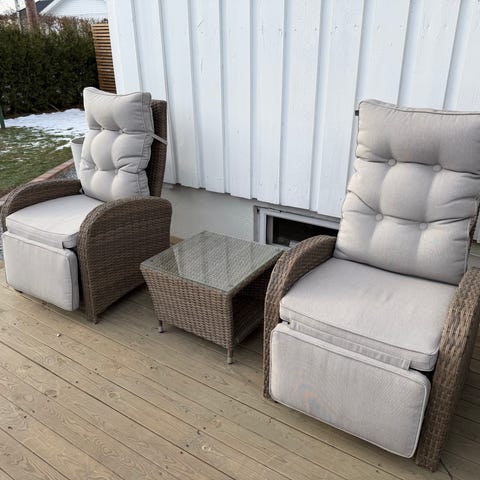 Møblene er godt vedlikeholdt og fremstår i pen stand. Passer perfekt til terrasse, hage eller veranda – enten du vil ha et stilrent uttrykk eller et komfortabelt utemøbelsett som faktisk blir brukt.