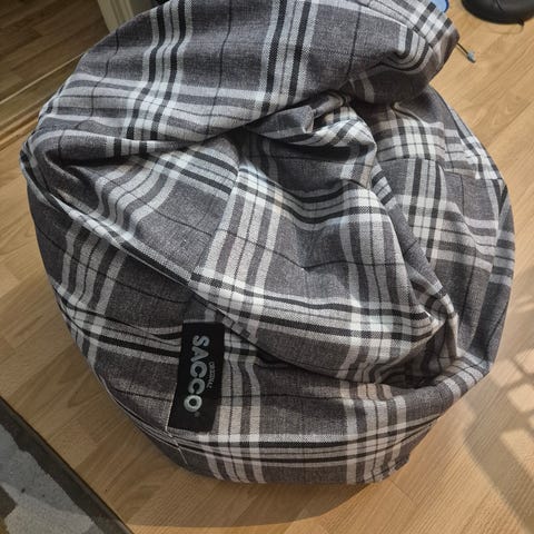 Sacco medium pluss selges for 300kr. Har ett hull som er reparert(se bilde). Må hentes i Bodøsjøen.