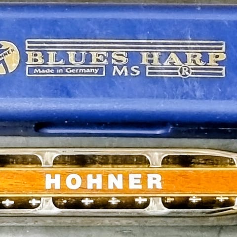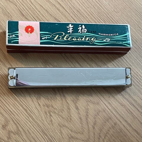 Munnspill med etui. Munnspillet leveres i et hardt plastetui og har metalloverflate. Det følger med en enkel bruksanvisning og pusseskinn for rengjøring og vedlikehold. Egnet som blåseinstrument for ulike musikkstiler.
