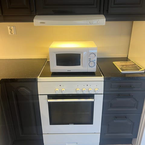 Mnikjøkken med komfyr, platetopp, kjøkkenvifte og kjøleskap hvit