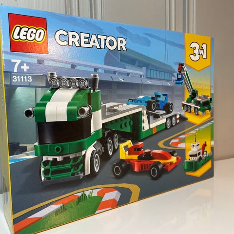 LEGO Creator bil i rød og hvit farge. Modellen bygges av klassiske LEGO-klosser og har detaljer som bevegelige dører og panser. Settet passer til lek. Kommer fra Creator og kan bygges til Fly eller T-Rex. Bare instrukser til T-rex medfølger. Bilen ser best ut etter min mening.
