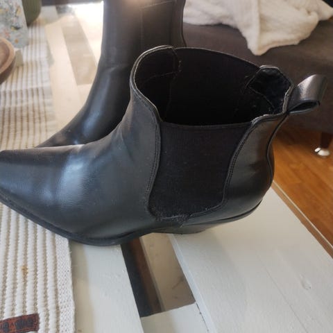Skoene er et par svarte ankelboots i semsket skinn med en biker- eller westerninspirert stil.