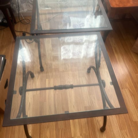 Hagebord med tilhørende stoler i grå kunstrotting. Bordet er rektangulært med glassplate på toppen. Settet består av et spisebord og flere stoler med armlener, egnet for bruk på terrasse eller i hage. Materialet er tilpasset utendørs bruk og gir et helhetlig uttrykk med matchende bord og stoler i samme farge og stil.