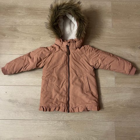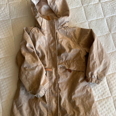 Newbie jakke for jente i størrelse 80. Jakken er beige og laget i akrylmateriale. Den har hette, glidelåslukking foran og to lommer med glidelås. Det er volangdetalj rundt midjen. Passer til barn ca. 9–12 måneder, avhengig av barnets størrelse. Egnet som ytterjakke i mildere vær.