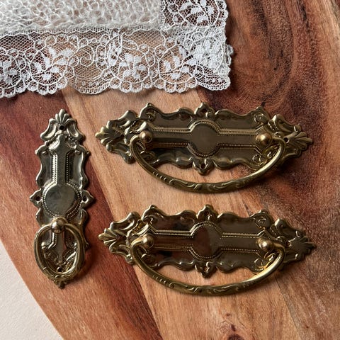 søkeord: metall dekor dekorasjon interiør pynt pyntegjenstand skuffer håndtak skuff knott messingknott