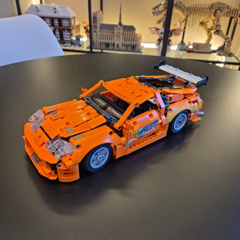 LEGO Technic Ford GT byggesett bil i blå nyanse med lyse striper. Modellen er en detaljert sportsbil med bevegelige deler som dører, panser og motorområde. Settet består av tekniske LEGO-elementer som gir en realistisk konstruksjon av bilen og egner seg for bygging og utstilling for LEGO-interesserte.