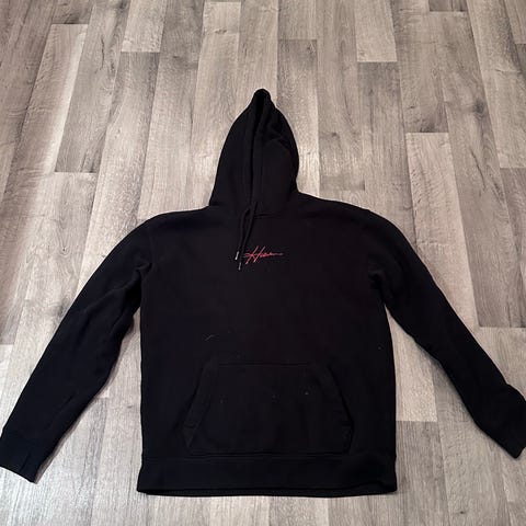hettegenser for herre i størrelse M. Genseren er svart og laget av bomull. Modellen har hette og lang erm. På fremsiden er det trykk med teksten «ye must be born again». Baksiden er ensfarget uten trykk. Passer til hverdagsbruk og som en del av et casual antrekk. Tar bare vipps, og kunde betaler frakt