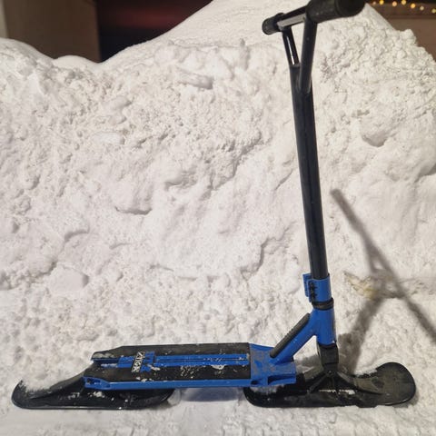 Sparkesykkel for snø med skiunderstell i blå farge. Modellen har håndtak med skumgrep og justerbart styre. Understellet består av to ski i plast som erstatter hjul, tilpasset bruk på snø og isete underlag. Egnet for barn som vil bruke sparkesykkel om vinteren.